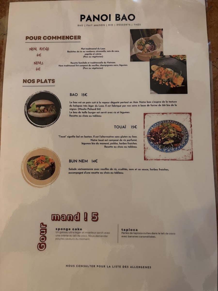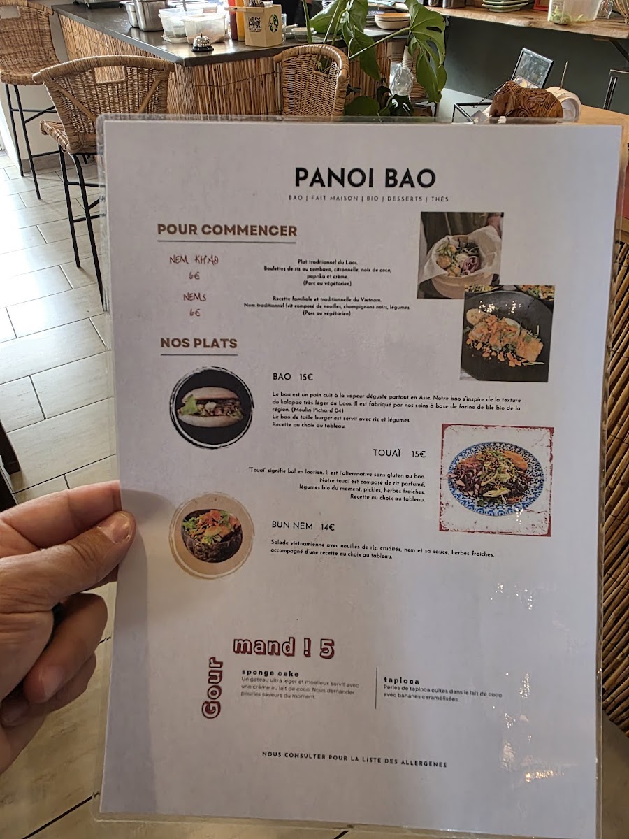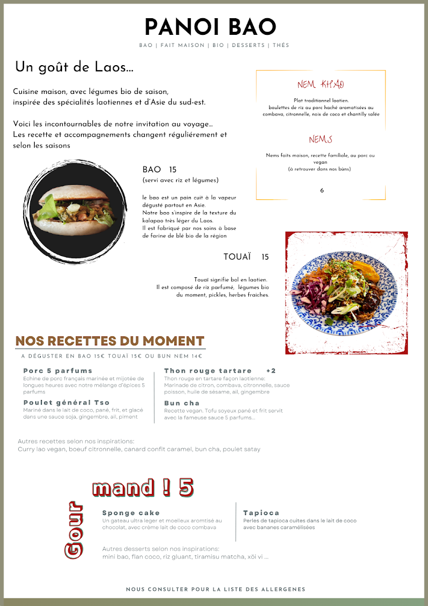 The menu at Panoï Bao offers a delightful variety of dishes that showcase bold flavors and fresh ingredients. Starting with the Nem khao and Nem, these starters set the tone for a satisfying meal, featuring traditional flavors with a modern twist. For those craving something unique, the BAO options are a must-try, offering soft, pillowy buns filled with delectable fillings. The TOUAÏ section presents a blend of flavors, with dishes that highlight the restaurant's creative approach to cooking. The Porc 5 parfums stands out in the NOS RECETTES DU MOMENT section, offering a rich and aromatic pork dish. Also worth noting is the Poulet général Tso, a flavorful take on a classic favorite, and the Thon rouge tartare, a refreshing choice for seafood lovers. For those with a passion for spice, the Curry laotien is a rich, comforting option. Finally, to satisfy the sweet tooth, the Gourmand! section offers indulgent desserts like the light sponge cake and the creamy Tapioca, perfect for finishing off the meal. Whether you're a fan of traditional or innovative dishes, Panoï Bao's menu offers something for everyone, with each dish promising a unique dining experience.