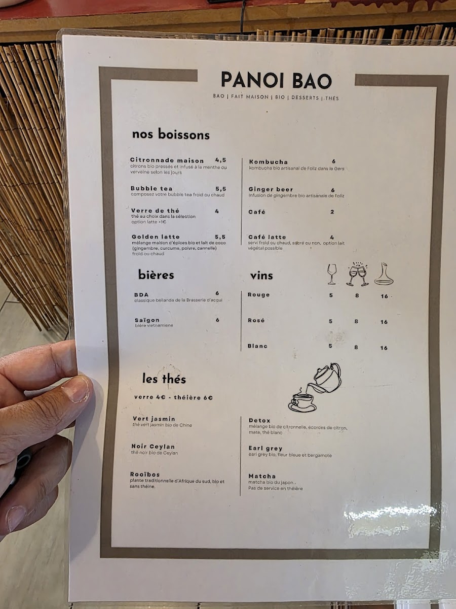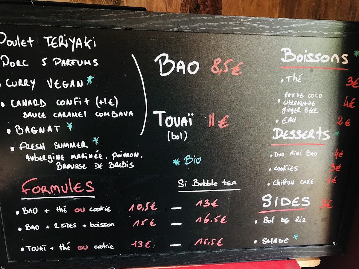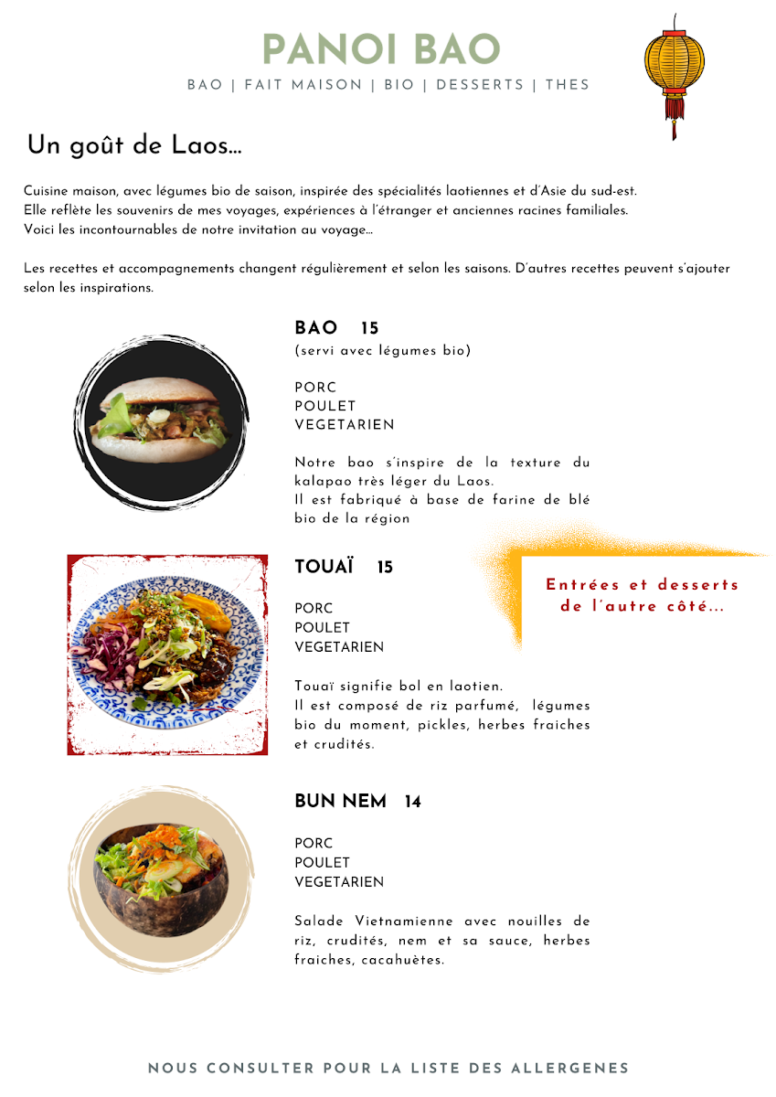 The menu at Panoï Bao offers a delightful variety of dishes that showcase bold flavors and fresh ingredients. Starting with the Nem khao and Nem, these starters set the tone for a satisfying meal, featuring traditional flavors with a modern twist. For those craving something unique, the BAO options are a must-try, offering soft, pillowy buns filled with delectable fillings. The TOUAÏ section presents a blend of flavors, with dishes that highlight the restaurant's creative approach to cooking. The Porc 5 parfums stands out in the NOS RECETTES DU MOMENT section, offering a rich and aromatic pork dish. Also worth noting is the Poulet général Tso, a flavorful take on a classic favorite, and the Thon rouge tartare, a refreshing choice for seafood lovers. For those with a passion for spice, the Curry laotien is a rich, comforting option. Finally, to satisfy the sweet tooth, the Gourmand! section offers indulgent desserts like the light sponge cake and the creamy Tapioca, perfect for finishing off the meal. Whether you're a fan of traditional or innovative dishes, Panoï Bao's menu offers something for everyone, with each dish promising a unique dining experience.